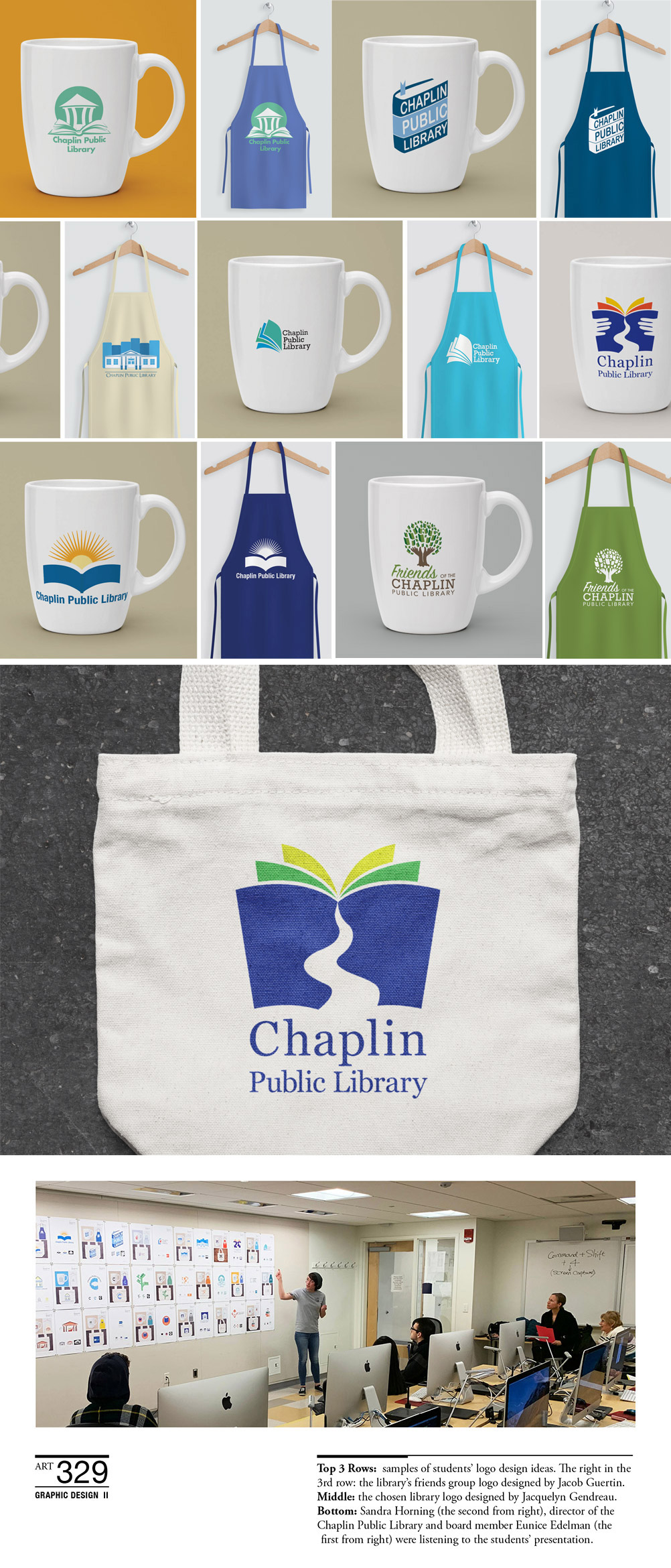 As one of the service learning components, the Chaplin Public Library logo design project was integrated into my Art 329 Graphic Design II class in 2019. The class focused on the study of visual identity design-one of our class topics and stu-dents developed various logo design solutions. All of the logos hung in the library for almost a month and patrons of the library could cast a ballot for the logo they liked best. The board was impressed with the originality of designs that students provided, and ultimately chose a logo for the library designed by Jacquelyn Gen-dreau and a second logo for a newly formed Friends of the library group designed by Jocab Guertin. During the project, the library director Sandra Horning visited the class and talked to the students about their need and vision of their identity. One of their board mem-bers Eunice Edelman and Sandra also joined the students' presentations and provid-ed every student valuable feedback for their designs. Meeting with the library staff helped students understand further about the skills of oral and visual communication. The students conducted their research on the town’s history and environment, came up with specific visual solutions aiming for the targeted audiences, and continued re-fining their designs based on the feedback gathered through individual and class cri-tiques. This real-world design practice effectively stimulated students and helped them develop a deeper understanding of conceptualizing their ideas by appropriately using design elements and aesthetics.