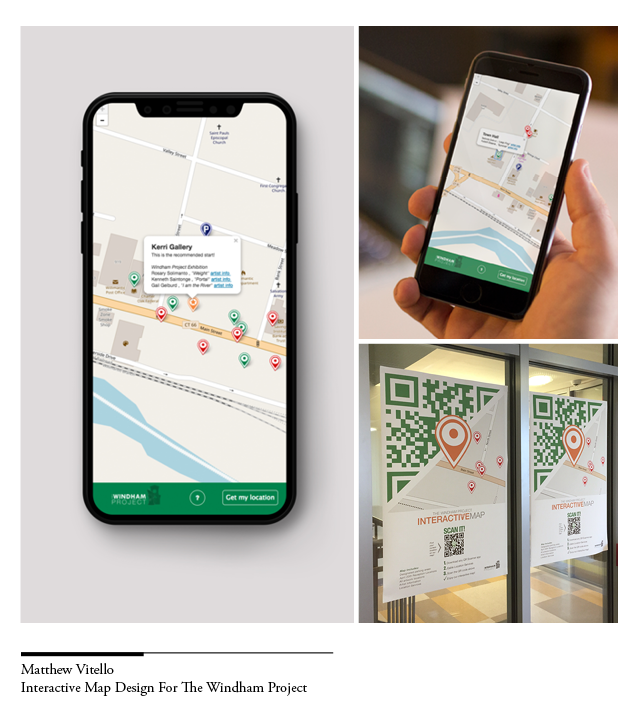 I directed one of my Independent Study students, Matthew Vitello, to develop the interactive map app for the Windham Project. The Windham Project was a collaborative project between Eastern Connecticut State University and the Town of Windham. As the Windham Project featured over twenty artists in the public art exhibition held in downtown Willimantic, CT, Professor Gail Gelburd who founded the project in 2015 discussed with me how to create a more efficient way to guide the viewers to each thriving art scene that artists presented. Aiming this goal, Matthew Vitello, our New Media Studies senior designed a map app that indicates viewer's current location, provides street info, controls the zoom level, and pinpoints the locations of all the artworks and parking nearby. This map app is embedded in the Windham Project official website and can also work alone in various devices. By scanning the QR code, viewers can access this map and find the directions they need on the go. Matthew also designed a poster to promote this creation and the copies of this poster were displayed on campus.