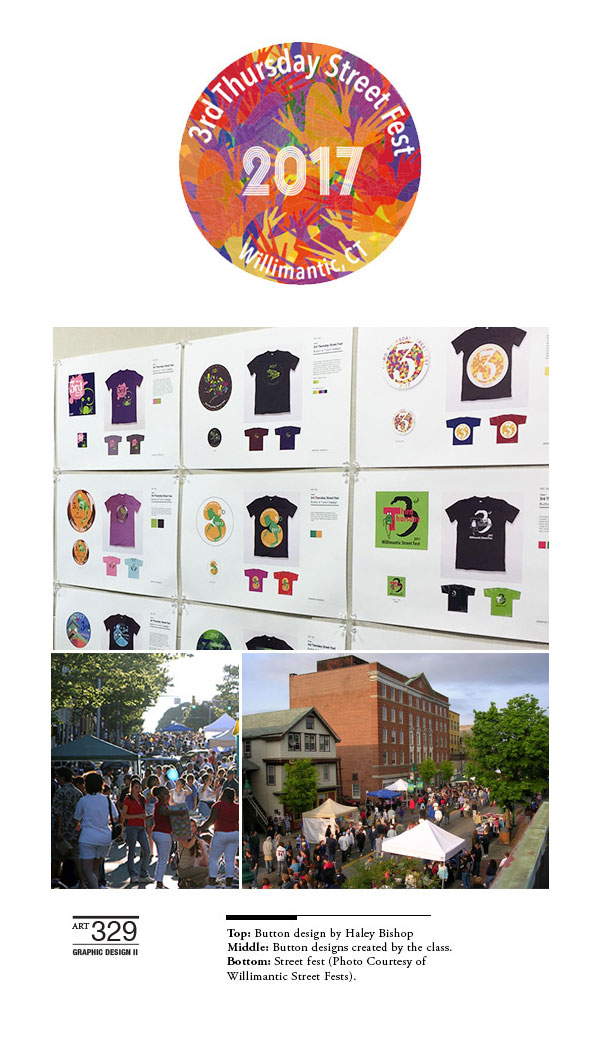 Willimantic 3rd Thursday Street Fest hosted by Willimantic Renaissance, Inc. (WRI) promotes the culture, spirit, and historic architecture of Williamntic. Every 3rd Thursday from May through September, five stages host music and entertainment while over 100 crafters and vendors showcase the wealth of goods and foods produced locally and regionally. It's a great opportunity for my Graphic Design II class to participate in this town fest. We developed several pin designs for this event and those designs were also planned to be printed on the T-shirts of the fest. As an enrichment project to the class, I set the goal not only to help students study the visual principles that can be applied to a successful graphic creation, but to get further understanding of conceptualizing and visualizing ideas with a real-world parameter. The introduction and event photos presented by Jean de Smet and Karen Gilbransen from WRI provided the class a closer view of WRI formed as a grassroots organization to revitalize downtown Willimantic by using the arts to enhance diversity, build community and attract consumers. It was a great experience for the students to understand the nature of this street event and to create the visual message that WRI was trying to convey under color and size limitations.