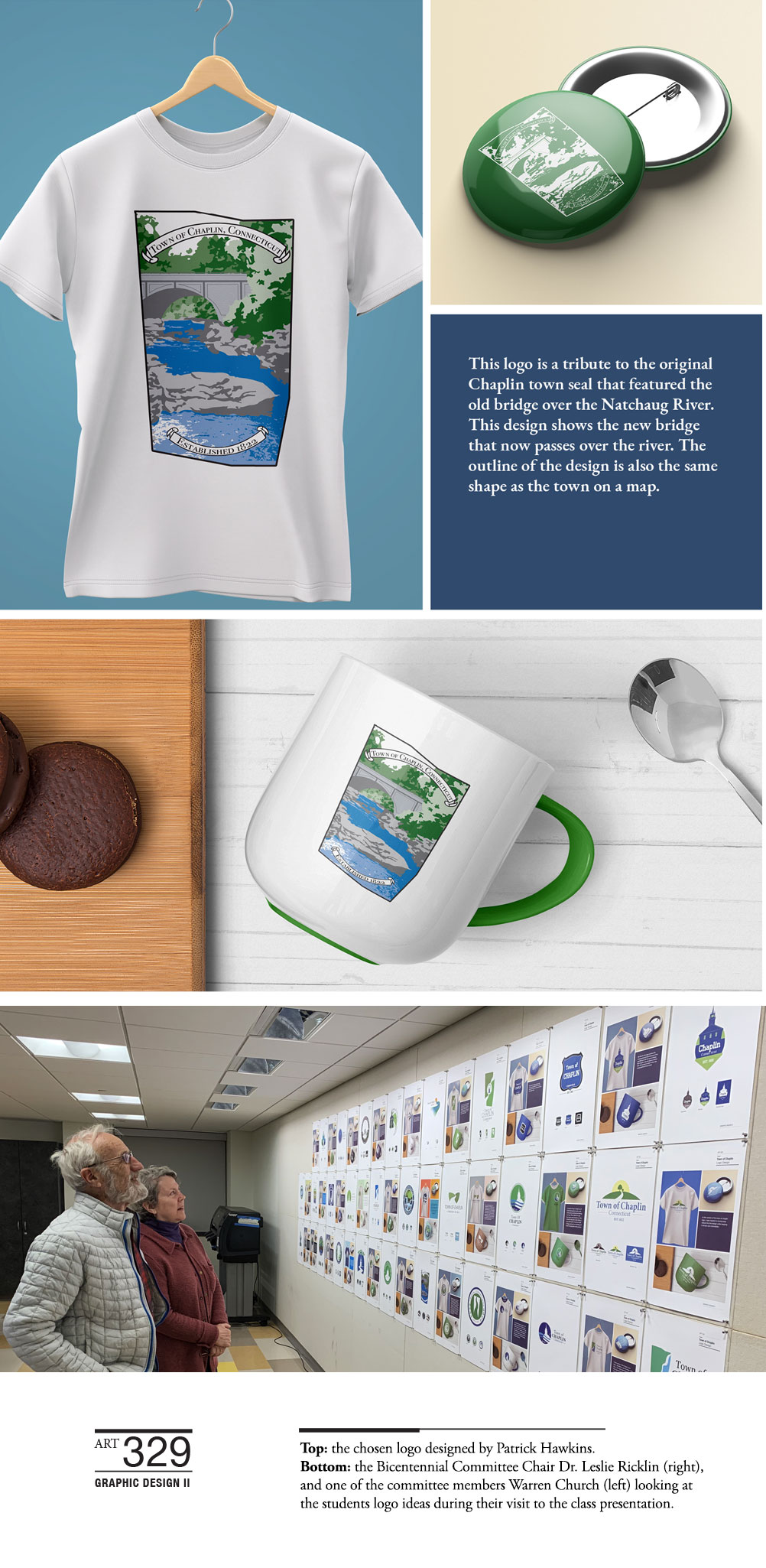 In 2020 Spring, Associate Professor Tao Chen’s ART 329 Graphic Design II class successfully designed a new logo for the town of Chaplin, CT. This new logo will be a critical component for the town’s bicentennial celebration. A substantial number of people across the town gave their unanimous votes during the month of April. The 3 finalists were Patrick Hawkins, Russell Lowell and Victoria Puapuaga, with Patrick Hawkins’ was chosen as the final design. For appreciating the work done by the faculty and Graphic Design II class on this important project, the Chaplin Bicentennial Committee voted to make a donation to the Arnold Prince Scholarship, one of the Art & Art History Department’s scholarship funds. During the project, the Bicentennial Committee Chair Dr. Leslie Ricklin and one of the committee members Warren Church made their visits to the class. They also joined the students' presentations and provided every student valuable feedback for their designs. As a class project, the students conducted their research on the town’s history and environment, came up with specific visual solutions aiming for the targeted audiences, and continued refining their designs based on the feedback gathered through individual and class critiques. This community-based project effectively motivated the students. Also, this design experience facilitated them to develop a deeper understanding of conceptualizing their ideas by using design elements and aesthetics appropriately and effectively.