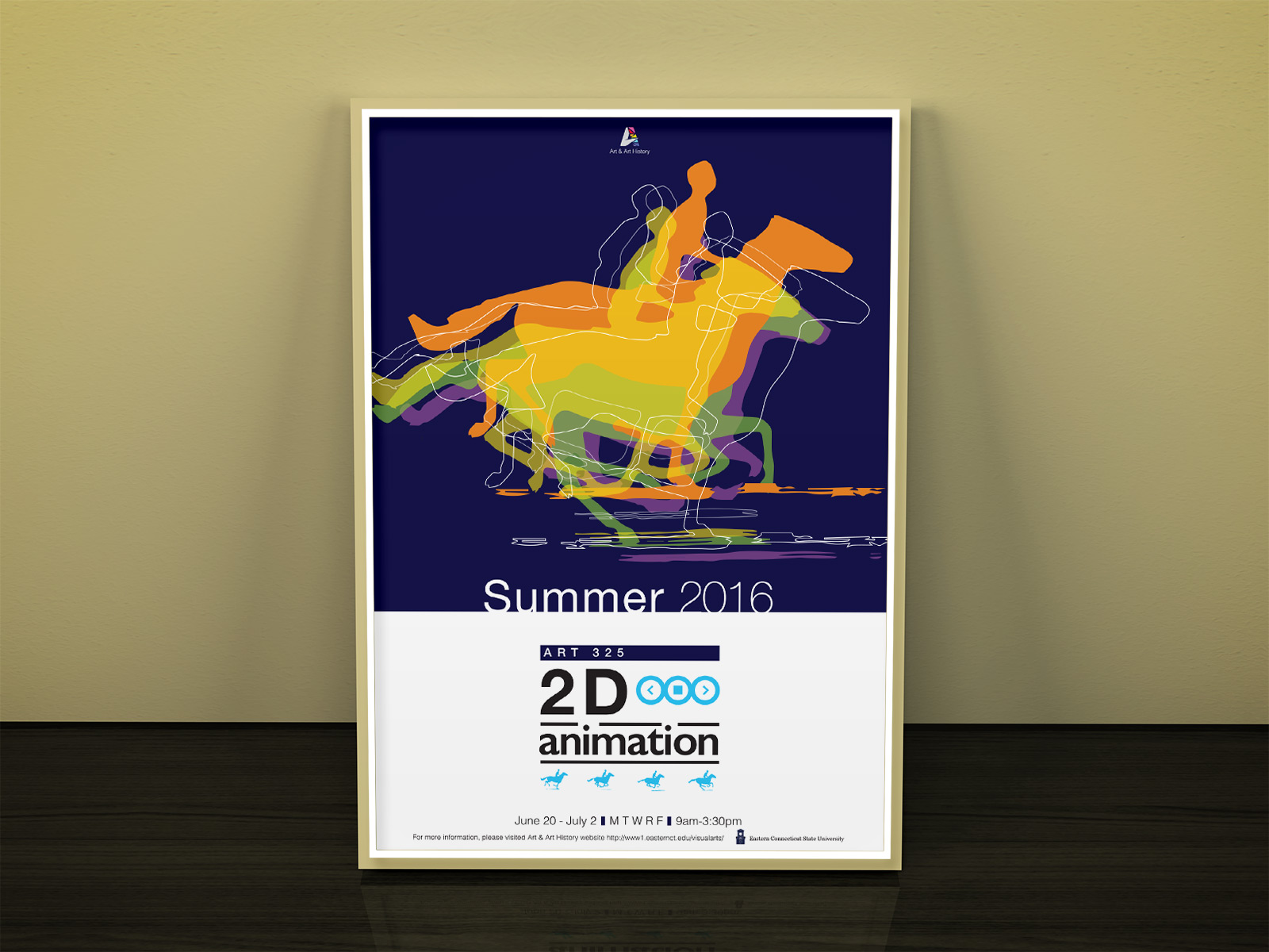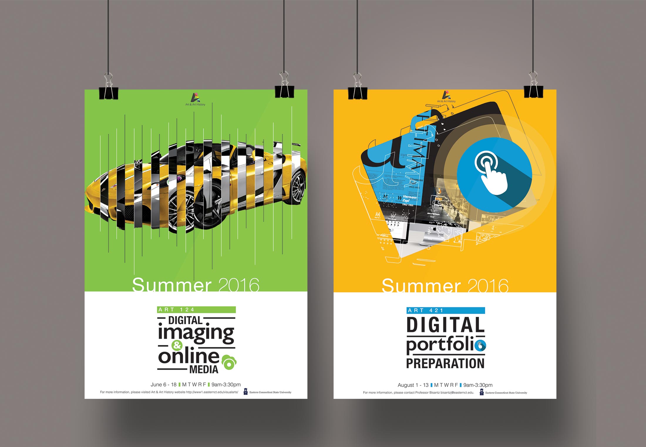 The three posters were designed for promoting Digital Art & Design summer courses. They are Art 325 2D Animation, ARt 124 Digital Imaging & Online Media and Art 421 Digital Portfolio Preparation.Poster were printed in 24" by 36" and fliers were in 11" by 17".
