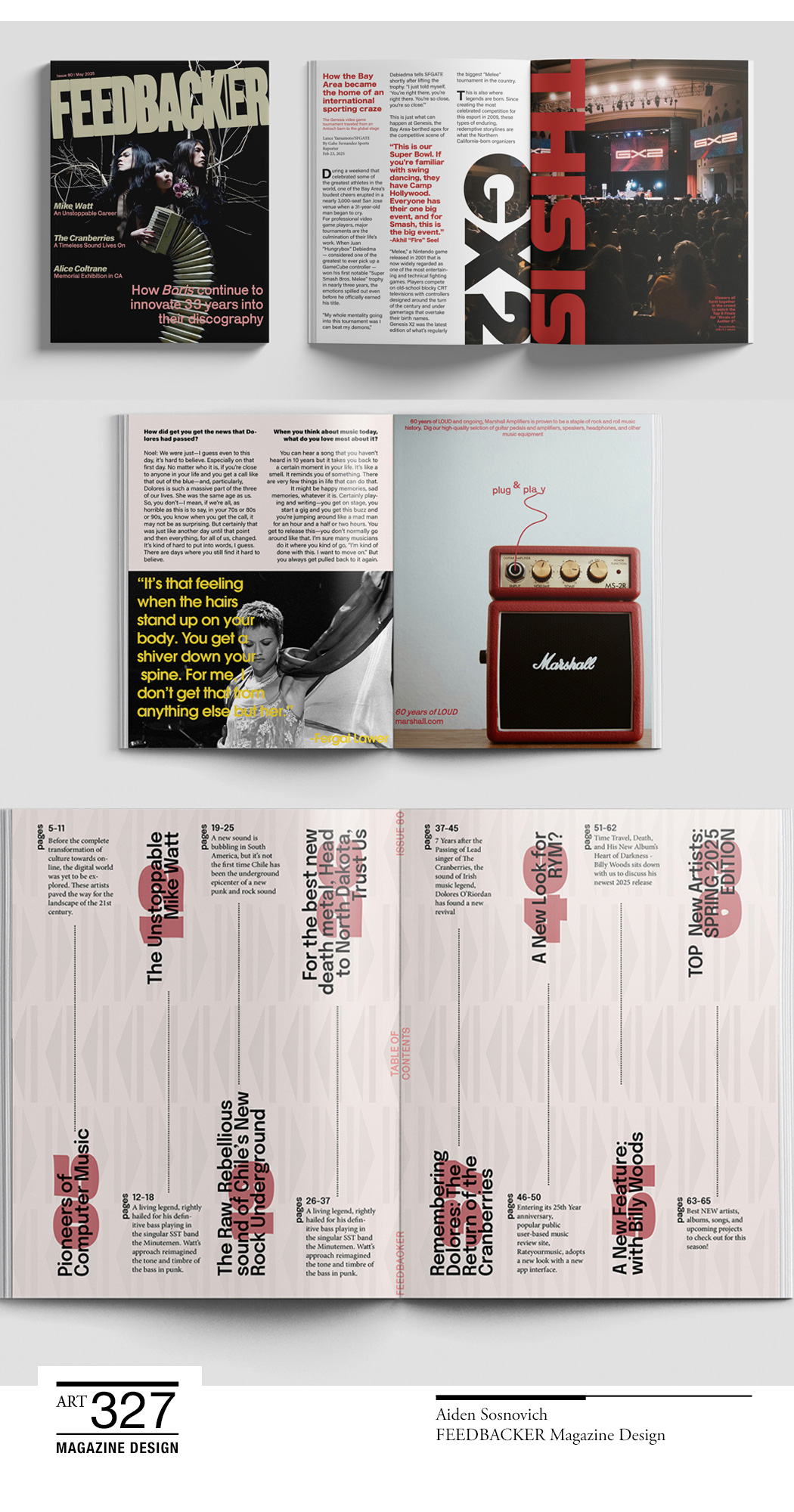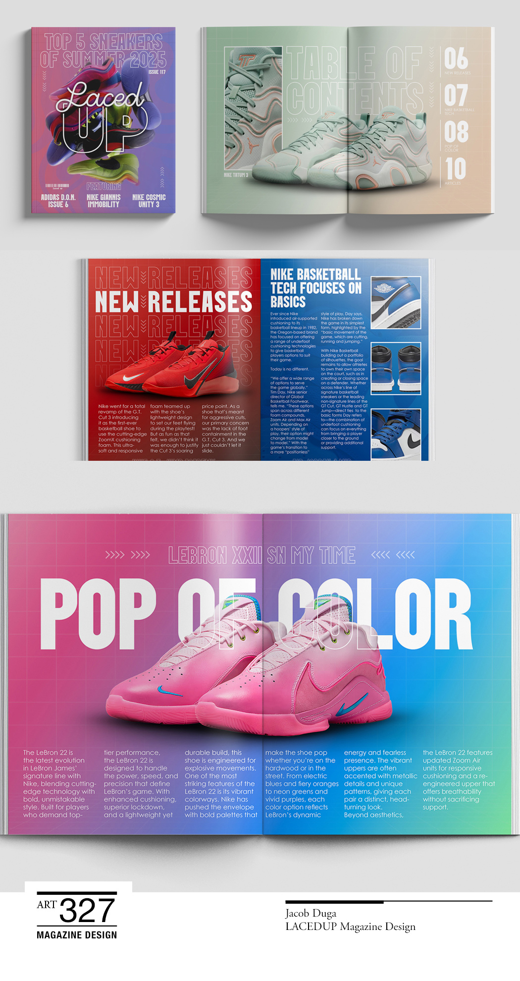 In this Project, students focus on creating a 10-12 page magzine design. It includes critical components of a magazine such as masthead, front cover, table of contents, magazine advertisements, lead article spread(s), and etc.