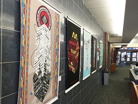 Visual Voice students' posters displayed in the J. Eugene Smith Library at Eastern.