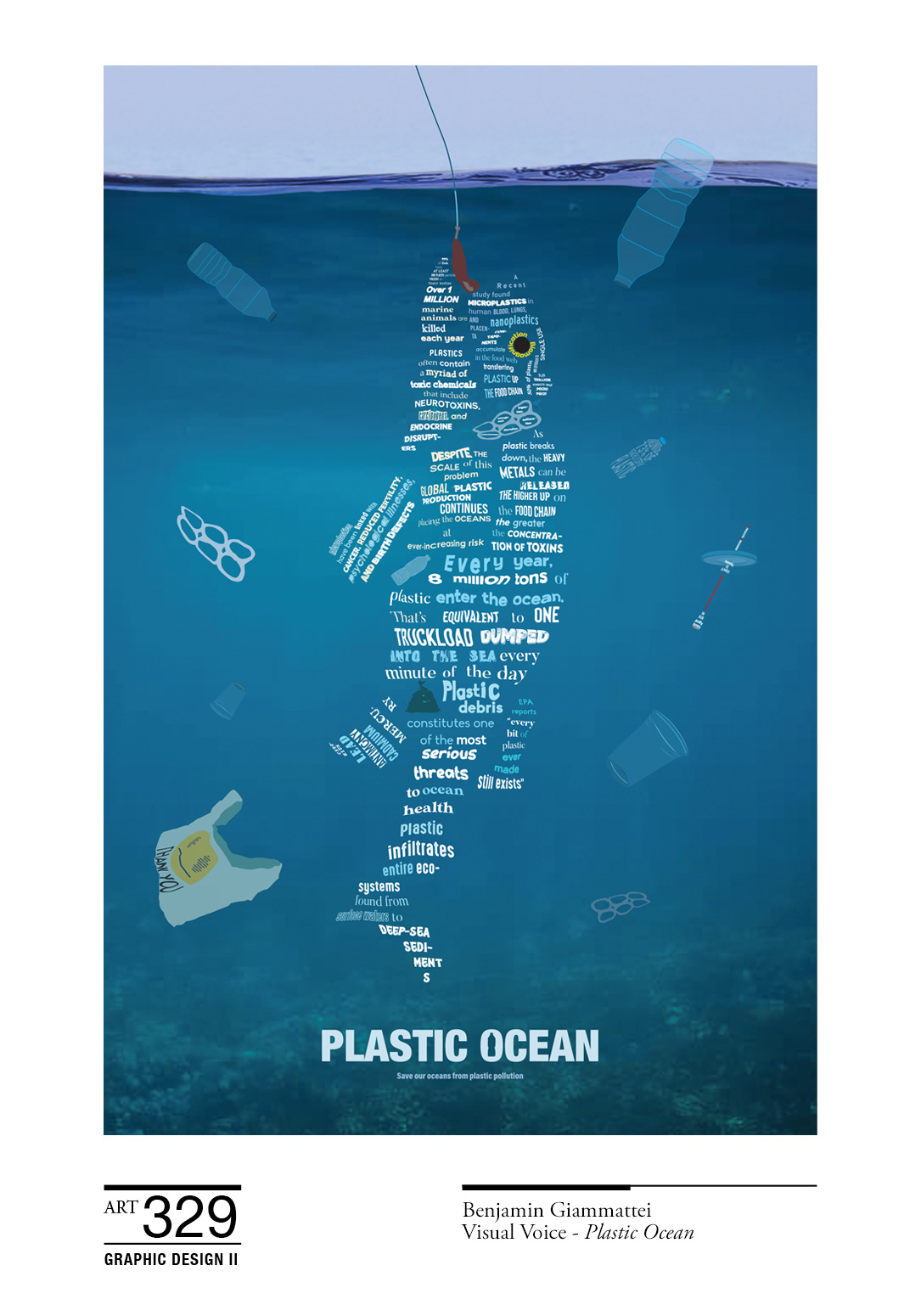 Visual Voice emphasized exploring the connection that graphic design, as a strong means of visual communication, can make between designers and their viewers. The students were asked to design a poster that focused on the cultural, environmental, political or social issues. They could choose topics such as Climate Change, Human Rights, Wild Animal Protection and etc. Through research and creative design process, the students expressed their feelings and ideas, and brought the public awareness and attention to the cultural, environmental and social issues they found in the world around us.