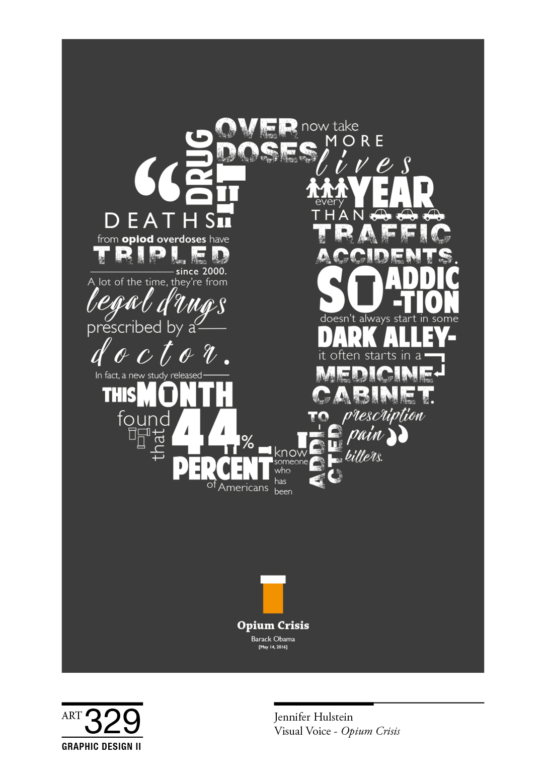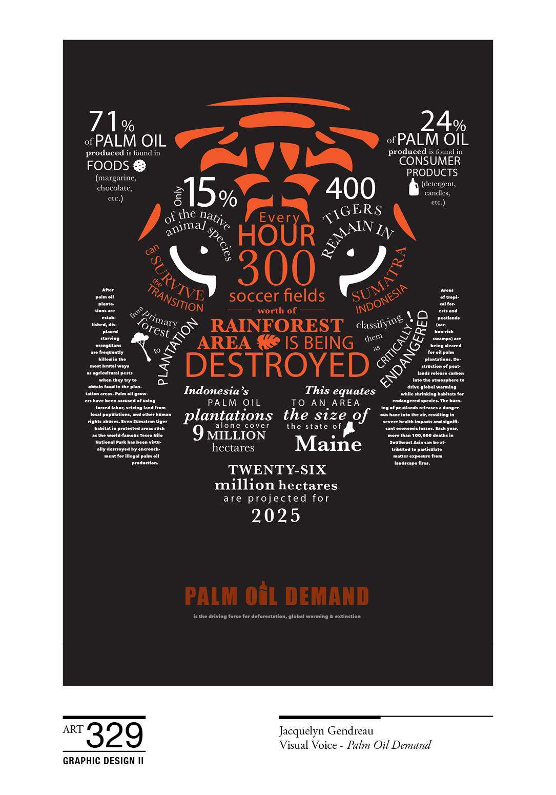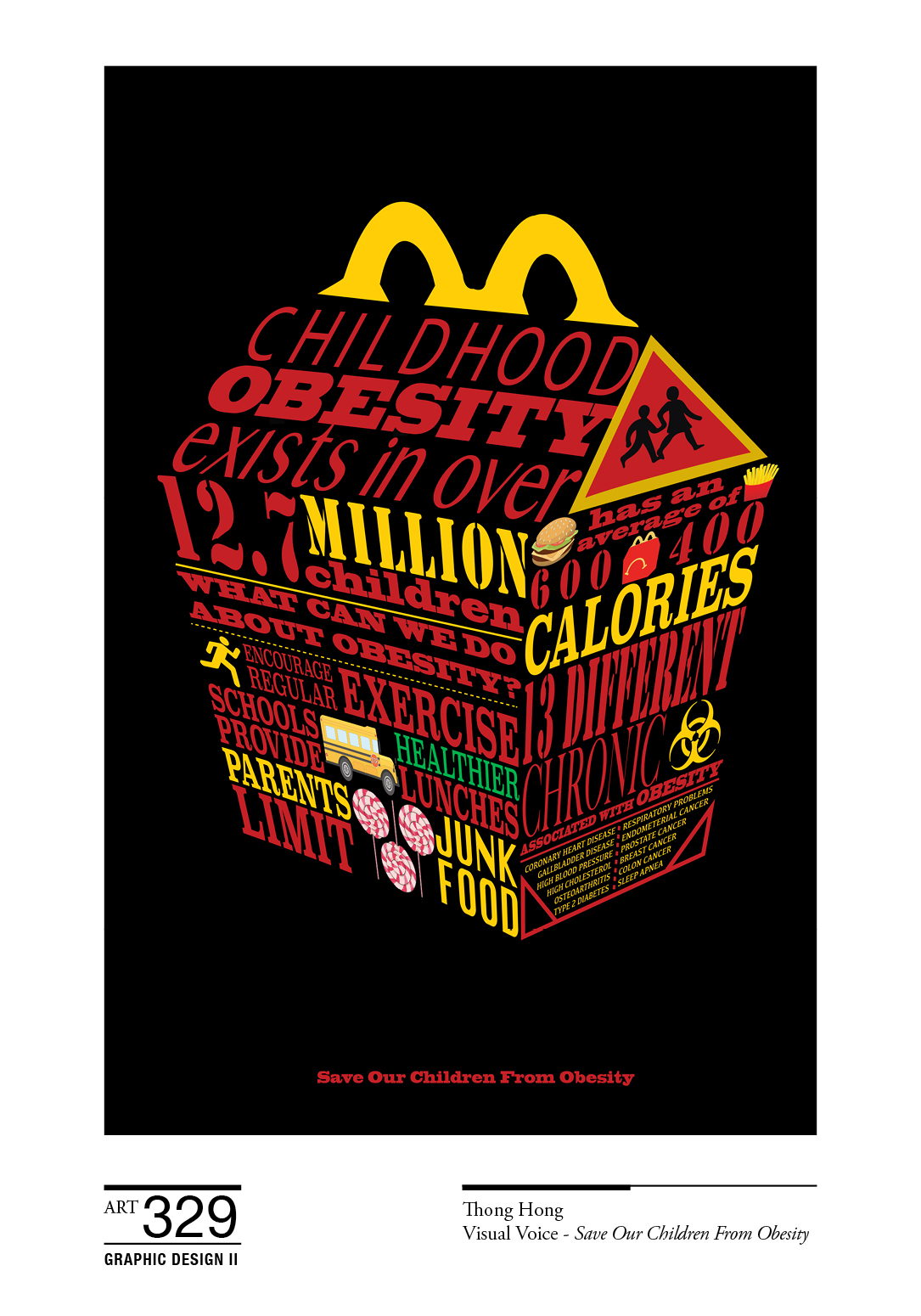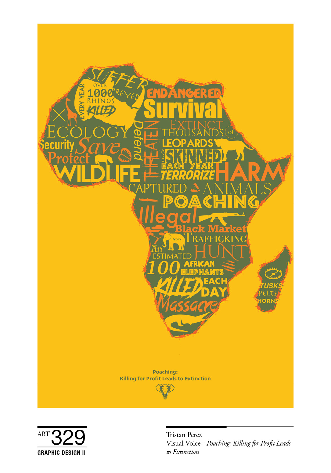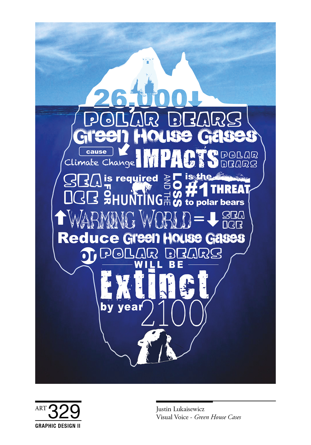 Visual Voice emphasized exploring the connection that graphic design, as a strong means of visual communication, can make between designers and their viewers. The students were asked to design a poster that focused on the cultural, environmental, political or social issues. They could choose topics such as Climate Change, Human Rights, Wild Animal Protection and etc. Through research and creative design process, the students expressed their feelings and ideas, and brought the public awareness and attention to the cultural, environmental and social issues they found in the world around us.